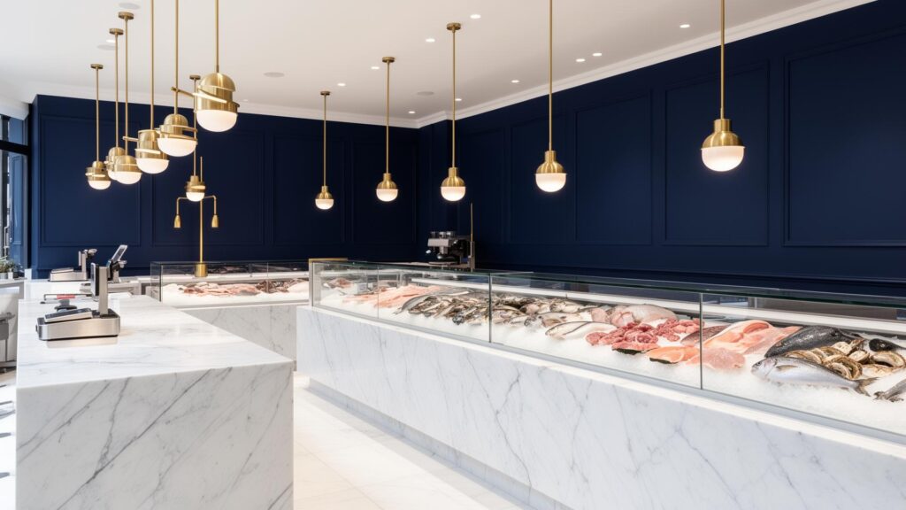A boutique dressed in marble, brass and midnight blue — conceived as a house of haute cuisine.